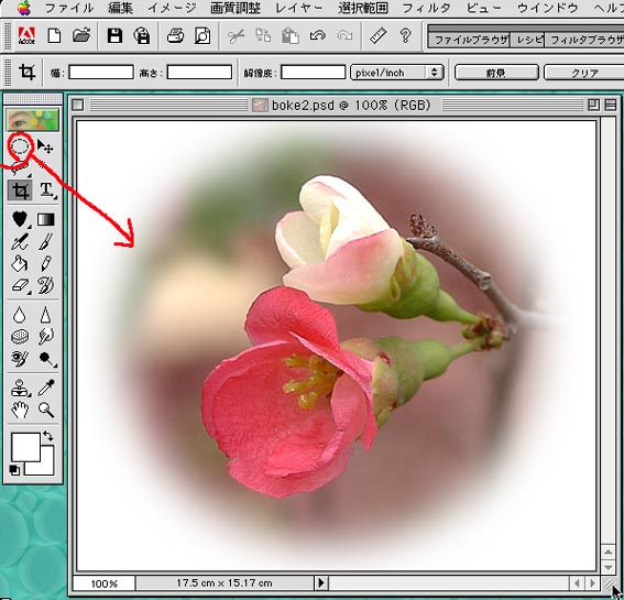 7)円形ボカシも「ツールを変えれば」やり方は同じです。 参考までに掲示しておきます。 成功を祈る! |
