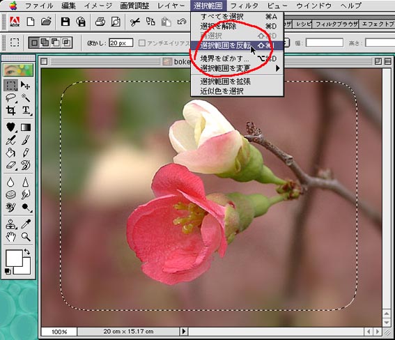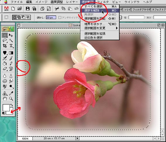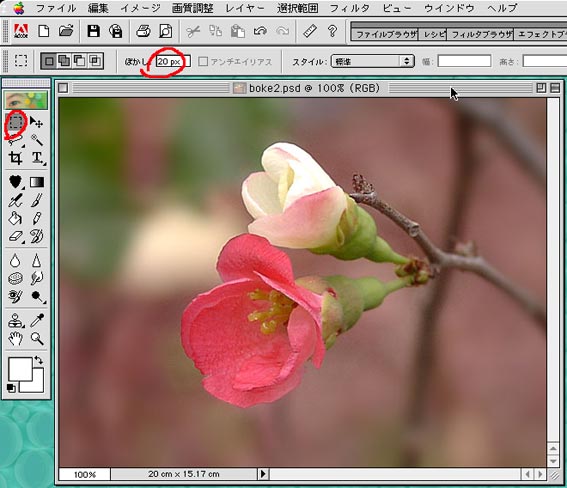 開き方は(その1)と同じです。 開いたら、ぼかしボックスに20と入れてください20%のことです。 つづいてツールボックスから四角の選択ツールをクリックして選びます。 |