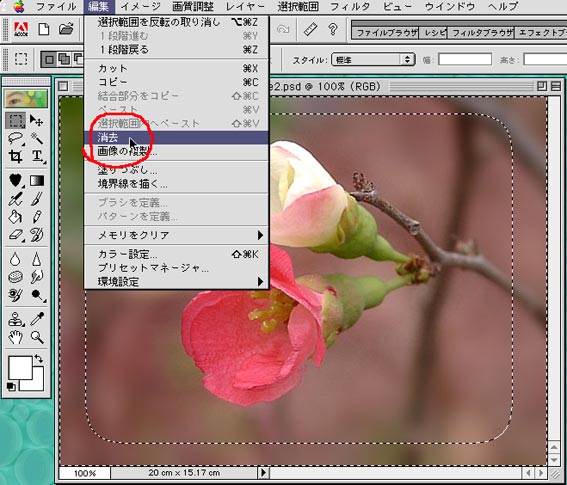 6)ハイッ、縁が白く綺麗にボケました。ボケ色は背景色と同じになります。 もっとハッキリボカしたいときはもう一度「消去」を実行してもいいですよ。 選択範囲から、選択を解除を実行してください。 これで終了です。 トップメニューのファイルからWEBに保存を選んで保存します。 (詳しいやり方は(その1)を参照してください。) |